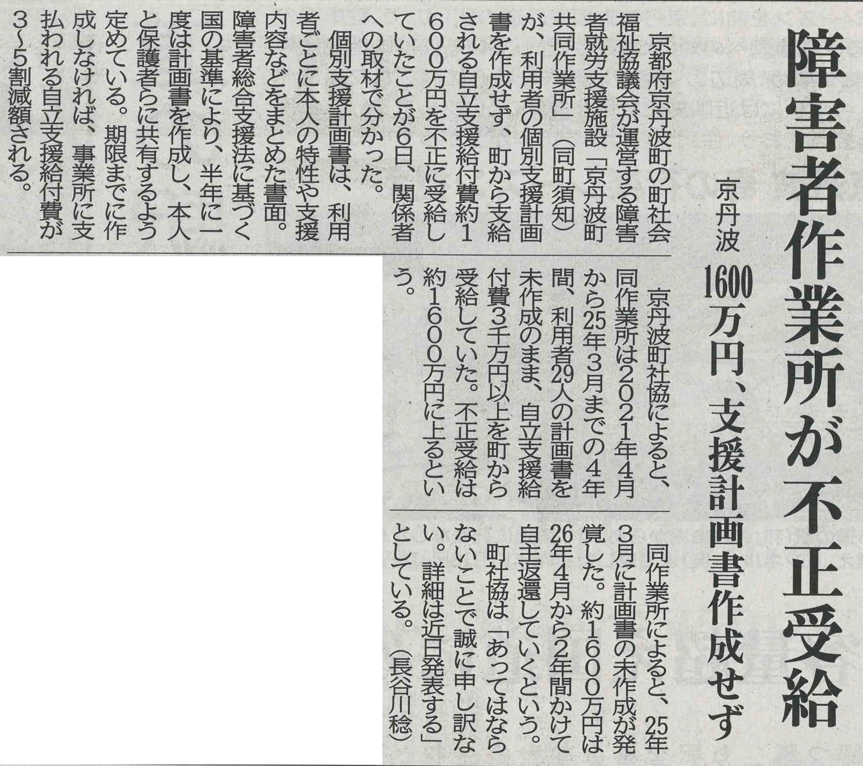 京丹波町の障害者就労支援施設が1600万円不正受給:京都新聞 長谷川稔2026/02/07