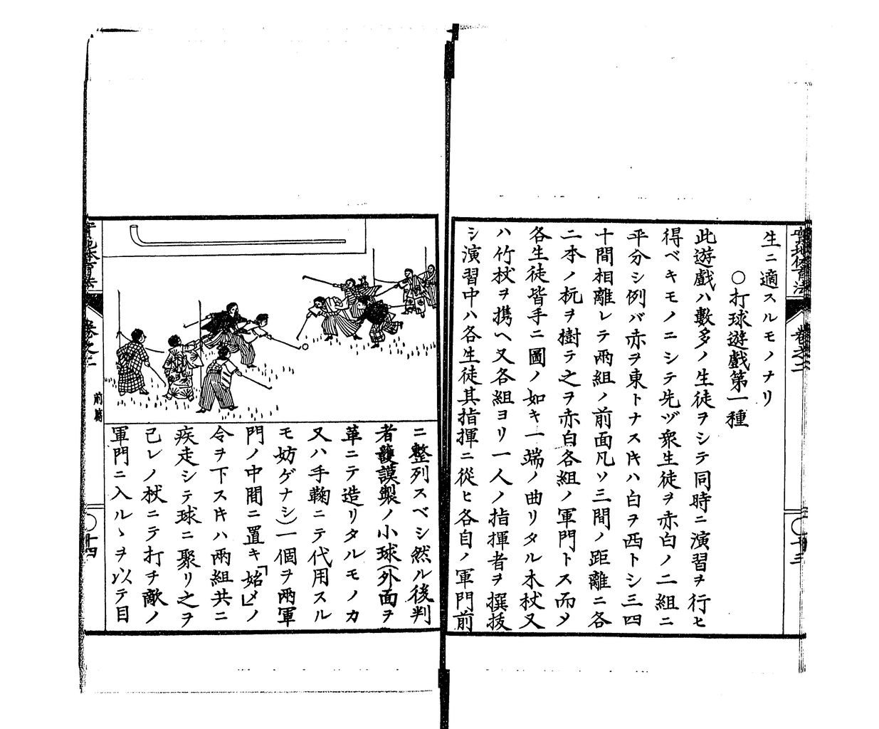 此の遊戯は総演習者を甲乙の二組に別ち各組には一人ずつ組長をおくべし。