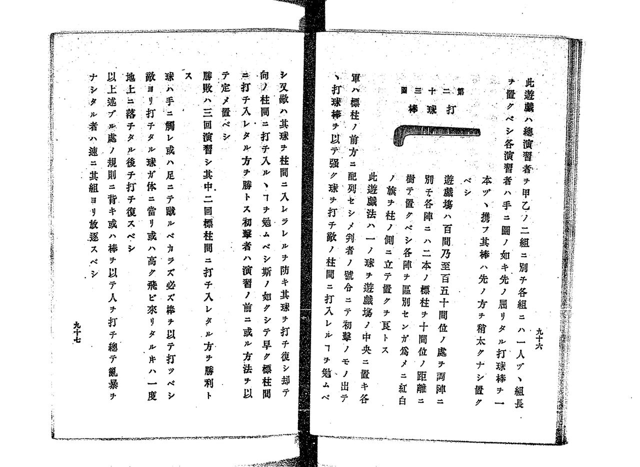 各演習者は手に圖(図)の如き先の屈りたる打球棒を一本ずつ携ふ。