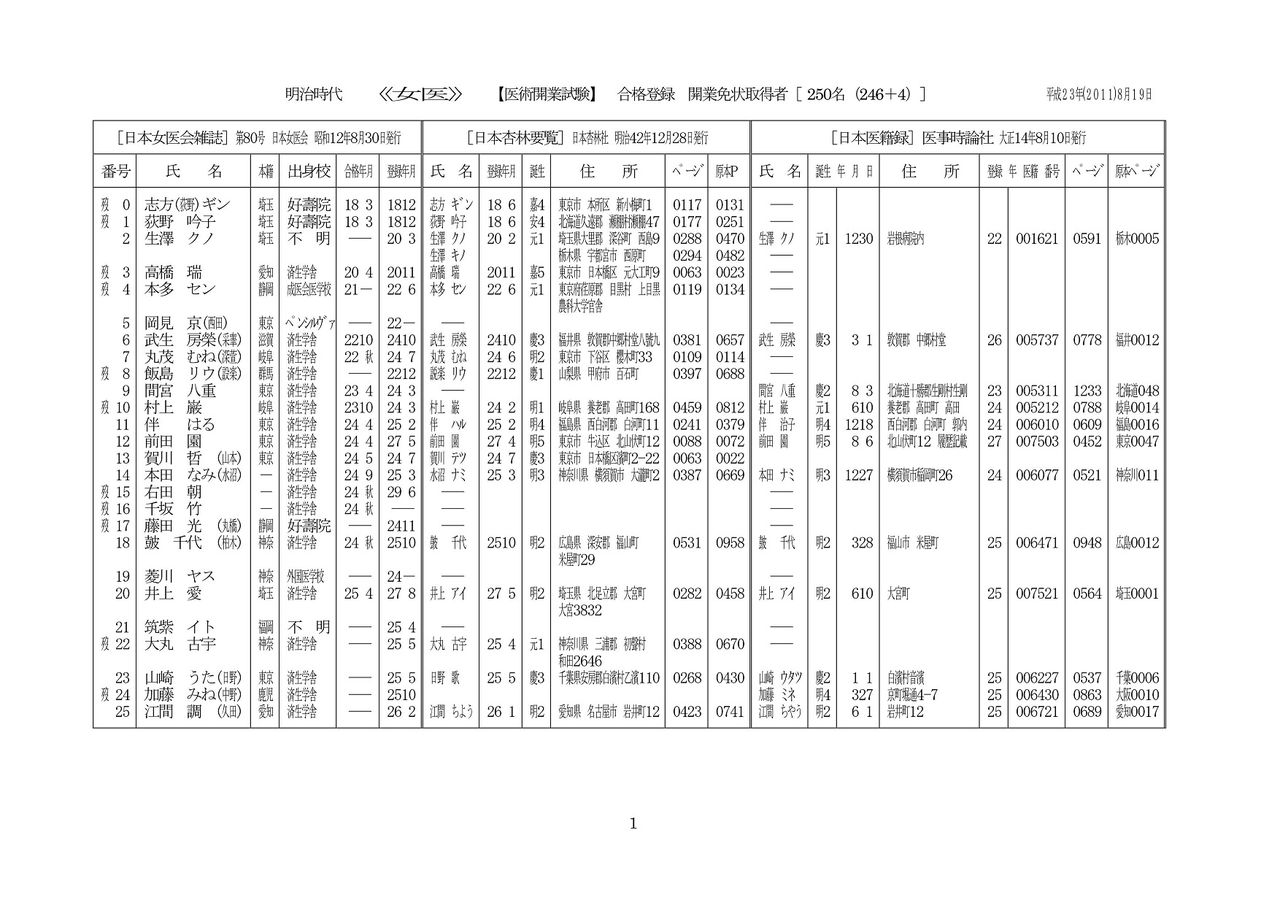 [明治時代の女医:250名(246+4)]《001-荻野吟子~025-江間 調》p1/11