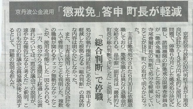 [京丹波公金流用「懲戒免」答申 町長が軽減]