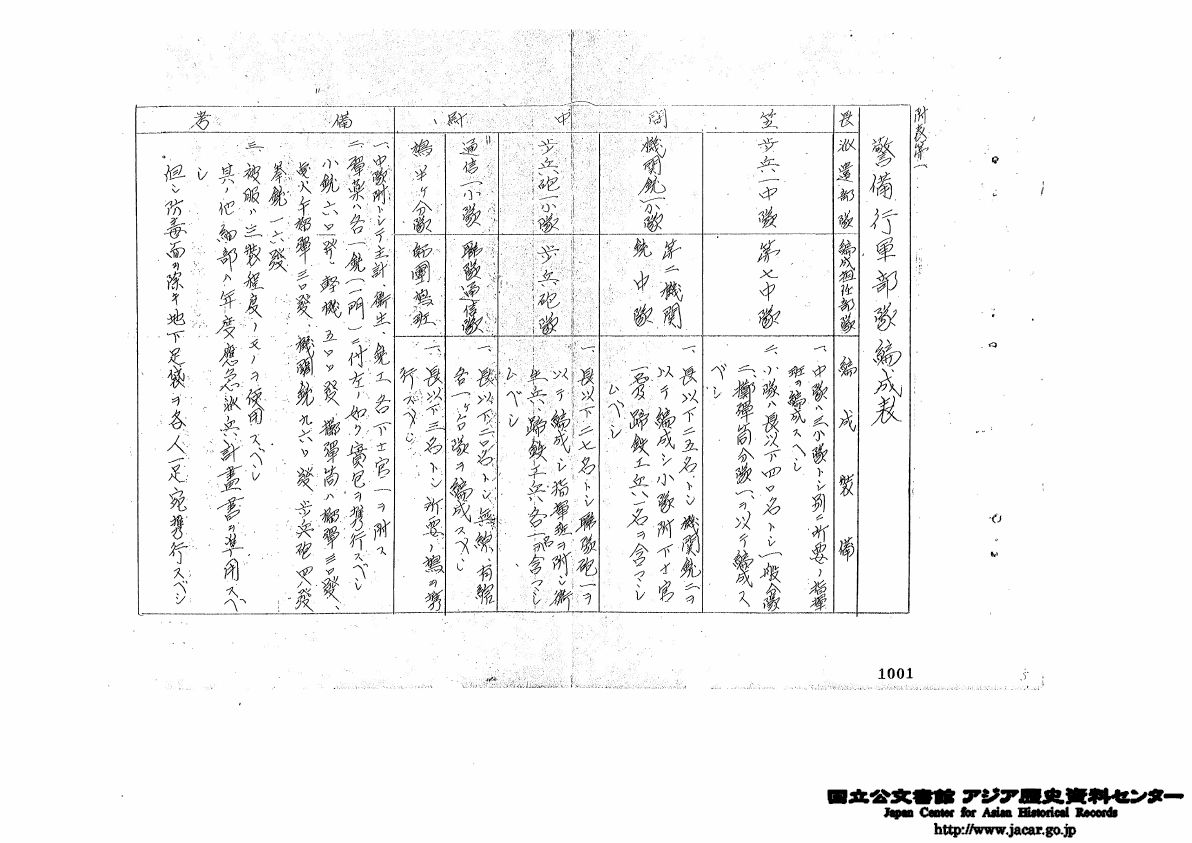 一、警備行軍部隊ノ編制裝備附表第一ノ如シ