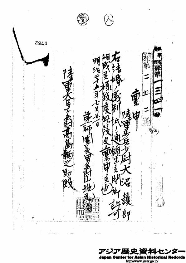 [大沼護郎歩兵少尉結婚願の件:大関増勤 養叔毋 珪子]明治25年7月21日