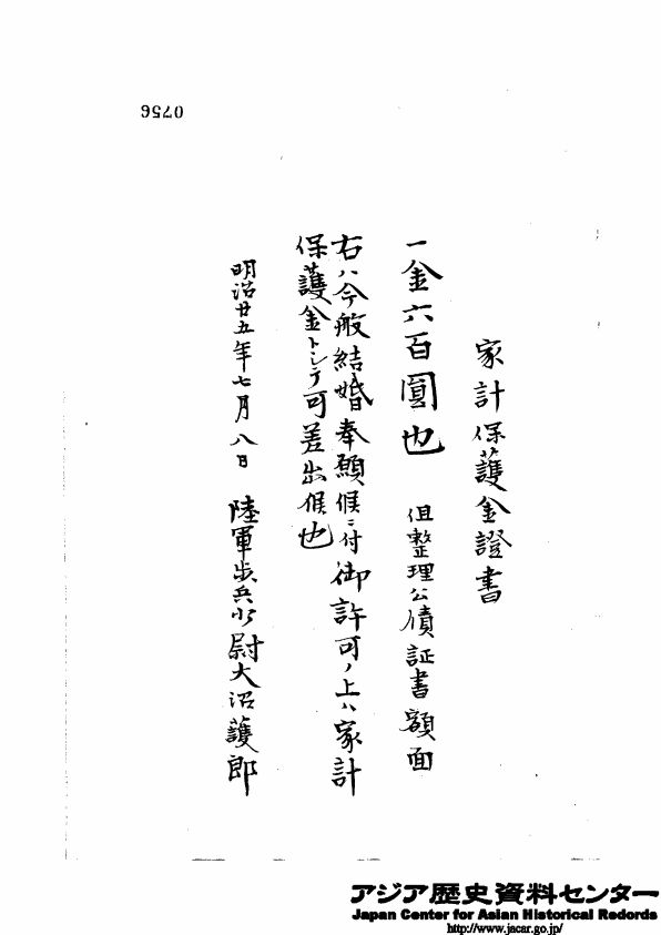 明治廿五年七月八日 陸軍歩兵少尉 大沼護郎