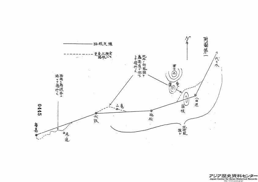 北西ノ向風強キ爲高度ヲ低下シテ飛行ス