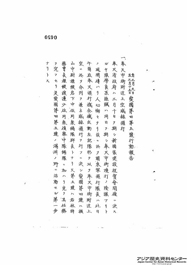 是 愛國第四第五號ノ滿洲ノ野ニ活動セル第一歩ナリトス
