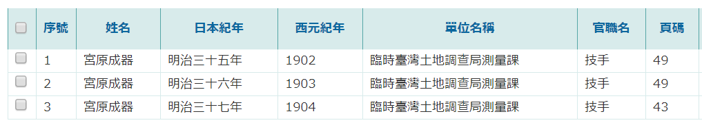 1 宮原成器 明治三十五年 1902 臨時臺灣土地調查局測量課 技手 49