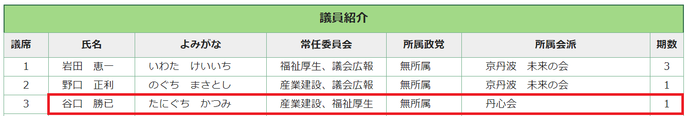 谷口 勝己 産業建設、福祉厚生 無所属 丹心会 1期