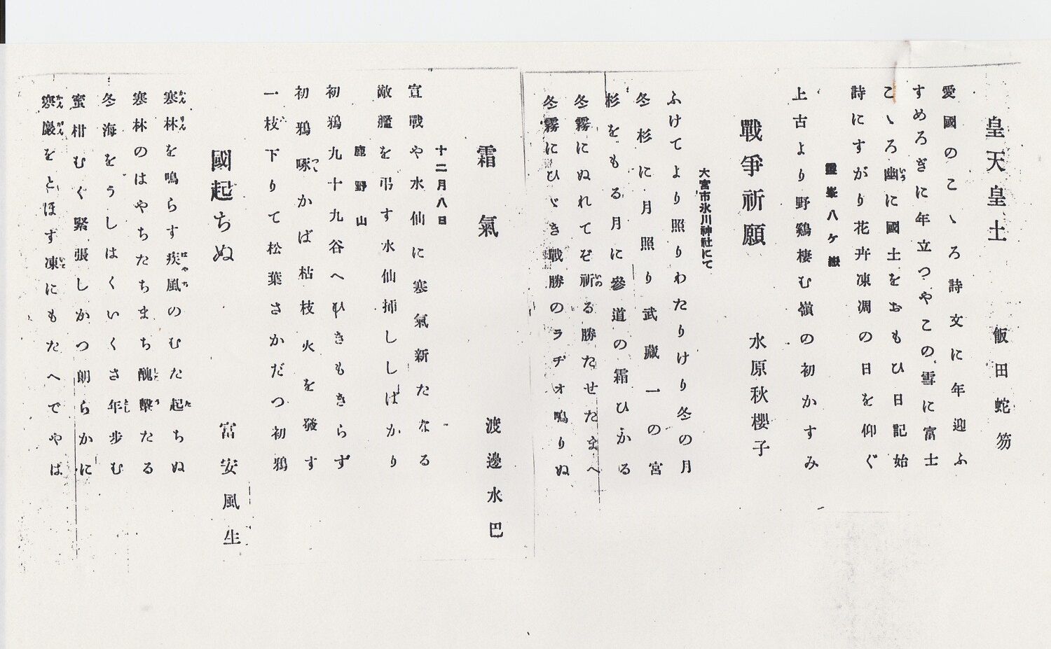 皇天皇土 飯田蛇笏・戰爭祈願 水原秋櫻子・霜氣 渡邊水巴・國起ちぬ 富安風生「改造」(昭和17年新年号)
