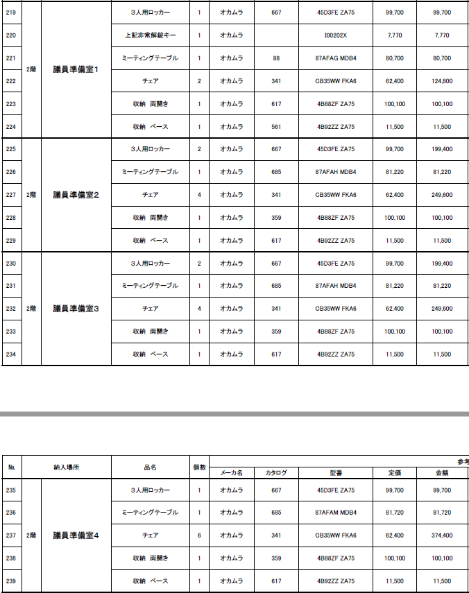 ※PDF【家具リスト】より※議員準備室1-4の机・椅子の合計金額 小野一雄