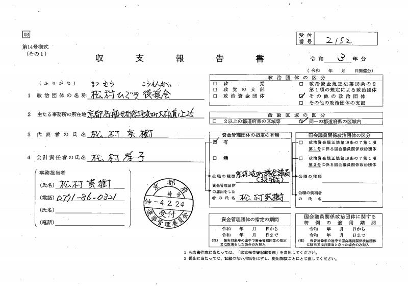 森田・松村後援会:いずれにも寄附金が記載されている。