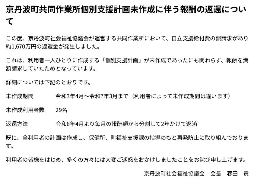 京丹波町共同作業所個別支援計画未作成に伴う報酬の返還について