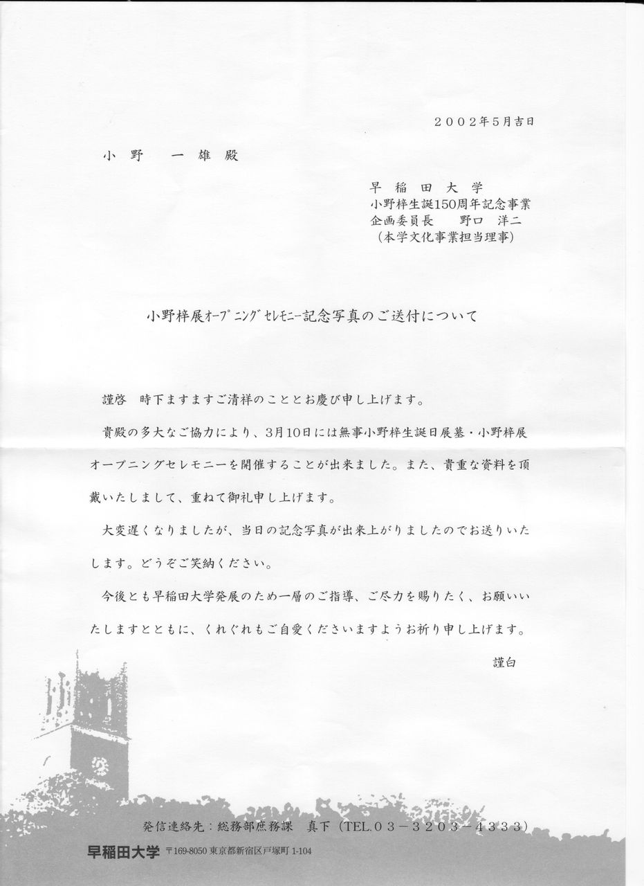 小野一雄殿 2002年5月吉日