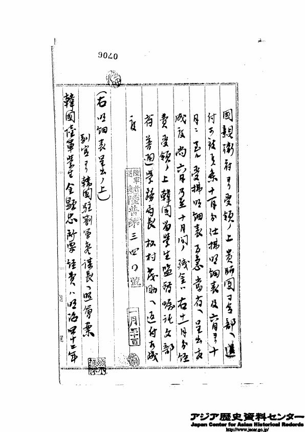 副官ヨリ韓國駐箚軍参謀長へ照會案