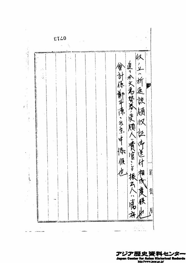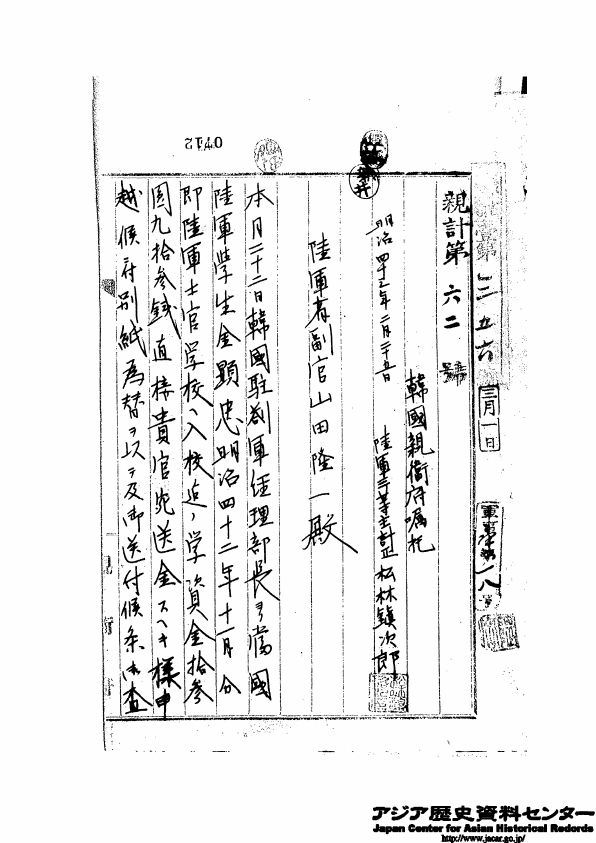 副官ヨリ韓国親衞府嘱託 松林主計正ヘ送付案