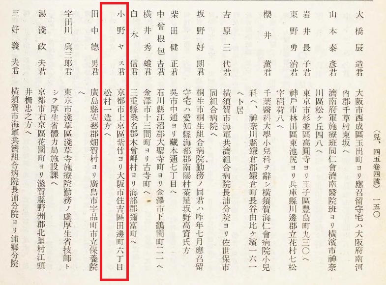 《小野ヤス》大阪市住吉區田邊町六丁目[松村一造方ヘ]
