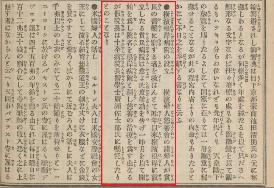 昨年以來横濱根岸に設立したる貧民病院は