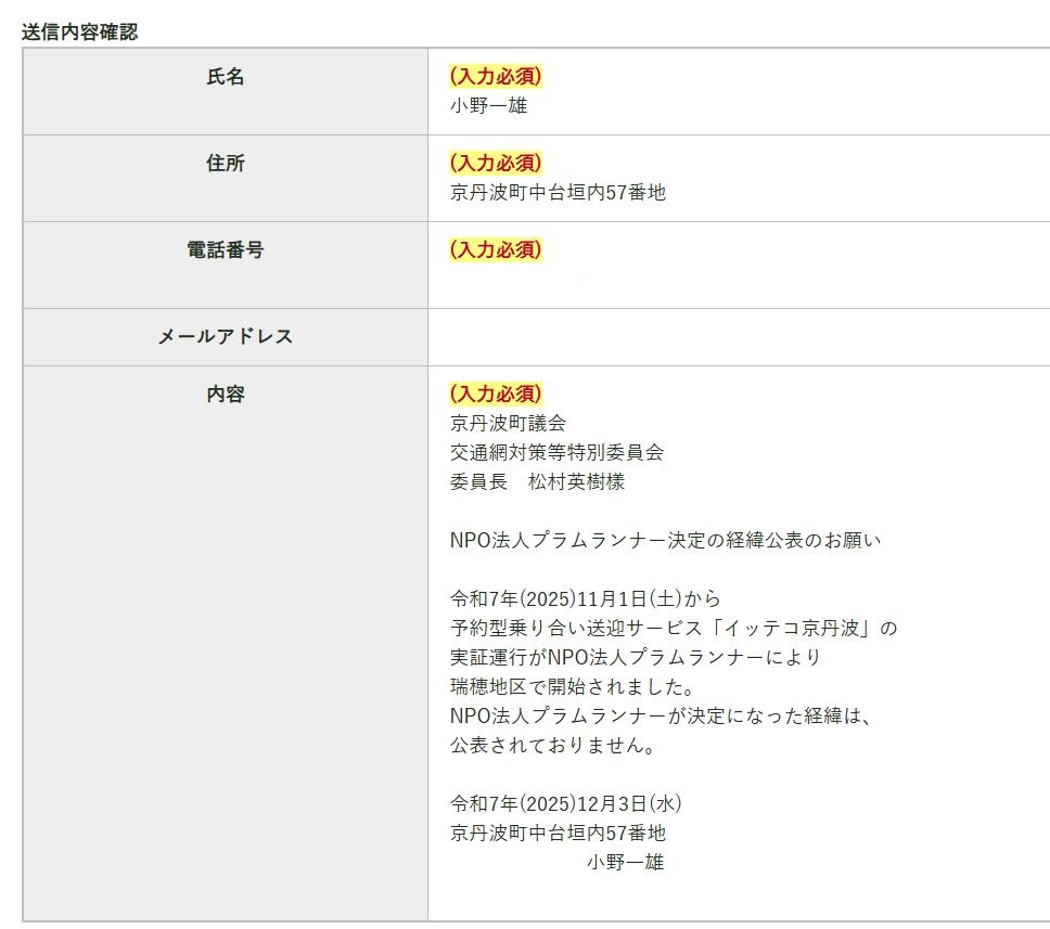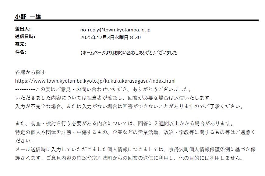 小野一雄から京丹波町議会事務局へ問い合わせ差出人:小野一雄