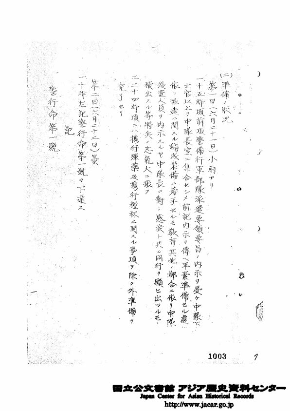 彈藥糧秣等ニ関シ 夫々中隊ノ関係者ヲシテ準備セシメ至