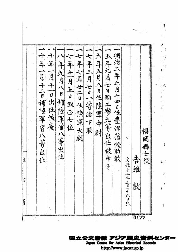 七年(1874) 進 陸軍大尉 叙正七位、