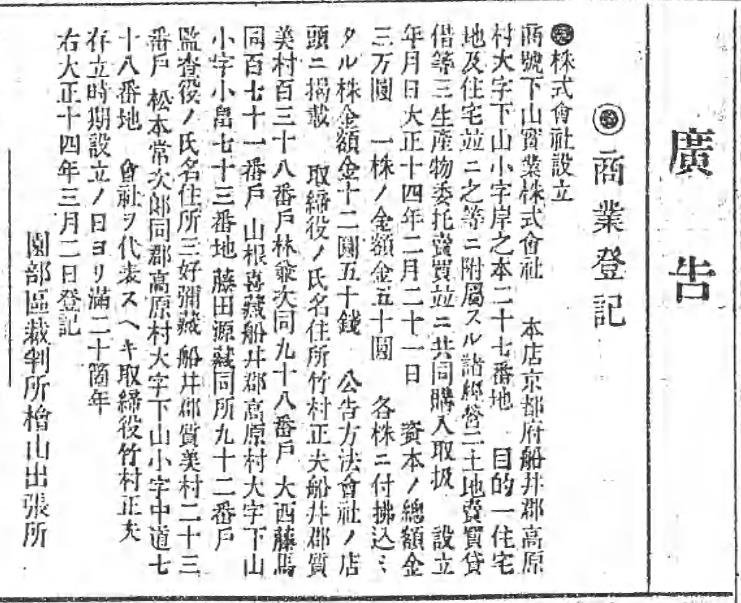 一 本店 京都府船井郡高原村字富田八十三番戸ノ一號